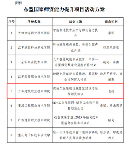 近日,中国教育国际交流协会公布2025-2026年东盟国家师资能力提升项目活动方案入选名单,我校申报的项目《交通工程基础设施智慧建设与运维师资培训》顺利入选并获资助。